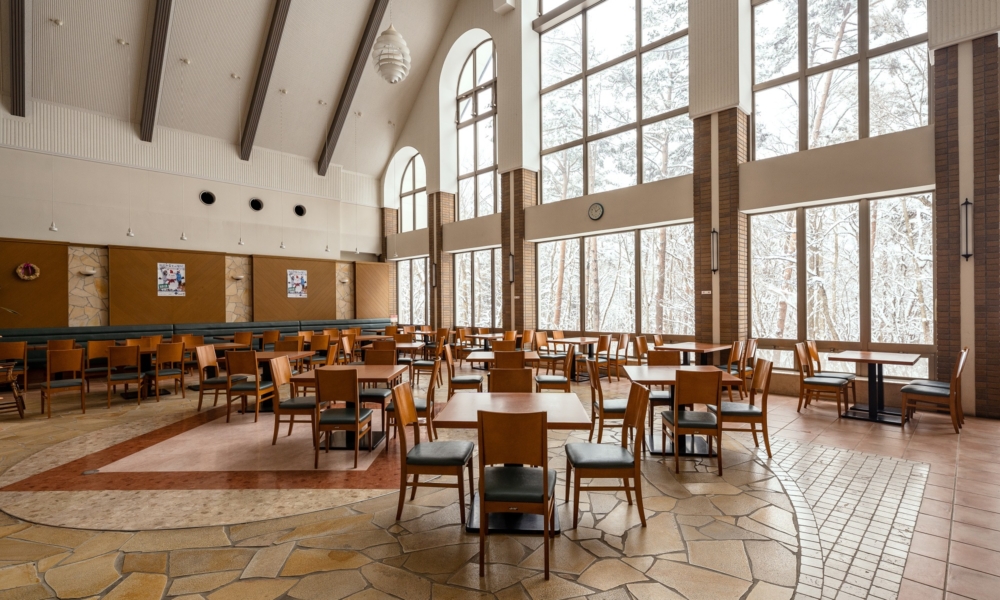 高い天井の明るい吹き抜けが開放的な雰囲気のレストラン「のばら」。窓の向こうに広がるひるがの高原の雄大な景色を眺めながら、地産の旬の食材をふんだんに使った自慢の料理をご堪能下さい。