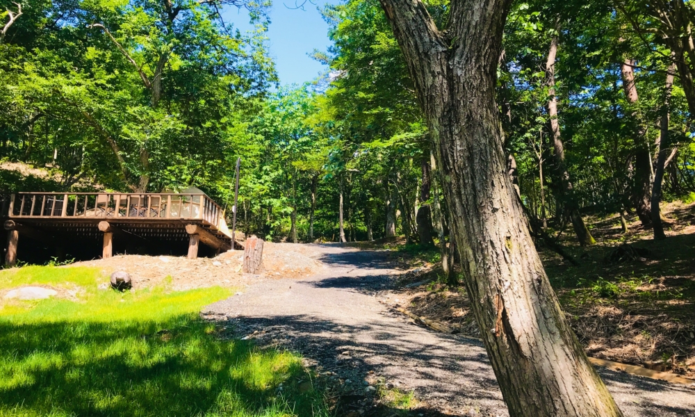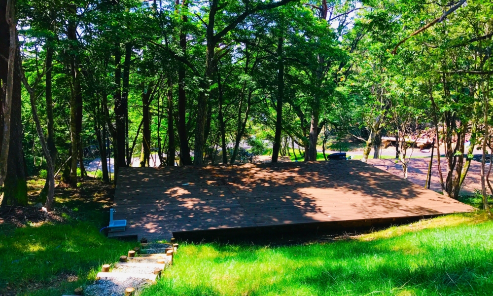傾斜地に位置するウッドデッキで人目を気にせずプライベートキャンプ、頂上付近、芝生サイトで楽しむキャンプ。樹齢80-120年の樹木が程よい木陰を作ります。手ぶらでのキャンプも可能です!