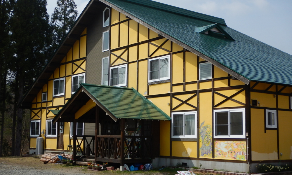 ひるがの高原に佇む黄色い壁に緑の屋根が目印の宿。
