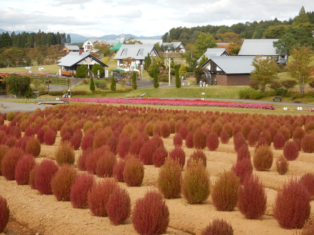 そして、牧歌の里の花の教会周辺にもコキアがあり、紅葉が楽しめます。牧歌の里の象徴でもある花の教会とコキアのコラボはとっても魅力的。