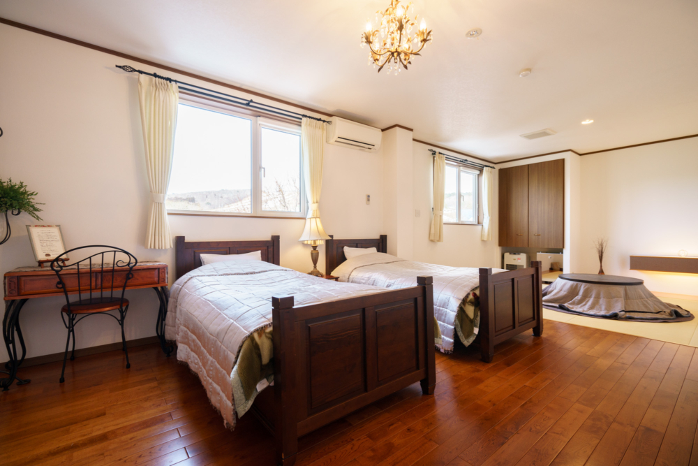 お部屋は洋室とツインベッドと畳スペースからなる和洋室をご用意。ベッドでぐっすり睡眠がとれるのもペンションのいいところです。