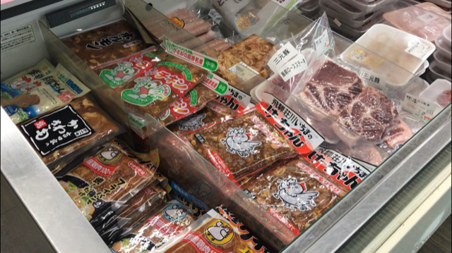 ひるがのの国道156線沿いにあるスーパーマーケット「フレッシュフーズひるがの」キャンプ場に近いこともあり地域住民以外の人にも多く利用されています。フレッシュフーズひるがのにも鶏ちゃんやBBQ用のお肉コーナーがあり、飛騨や高鷲内の鶏ちゃんを買うことができます。(ここにも牧歌けいちゃんあります)