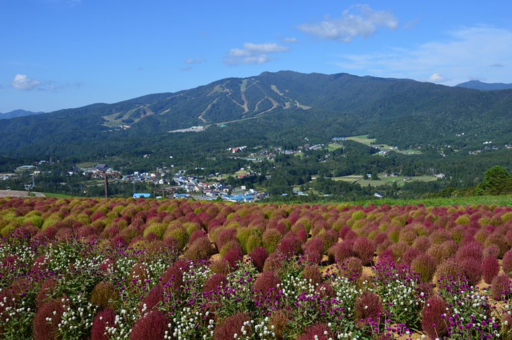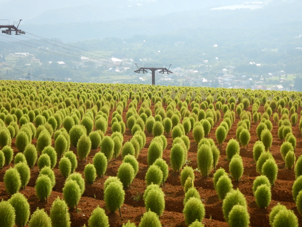 もう一つが同じみ「コキア」です。日本名はほうき草と呼ばれ、丸くかわいらしい形が特徴。オープン当初はまだ細長いコキアが夏の後半には丸々大きな姿に変わります。そして、9月末には真っ赤に紅葉し絶景となります。山々の紅葉より少し早く赤く染まるコキアはひるがの高原に紅葉の季節をお知らせしてくれる植物です。