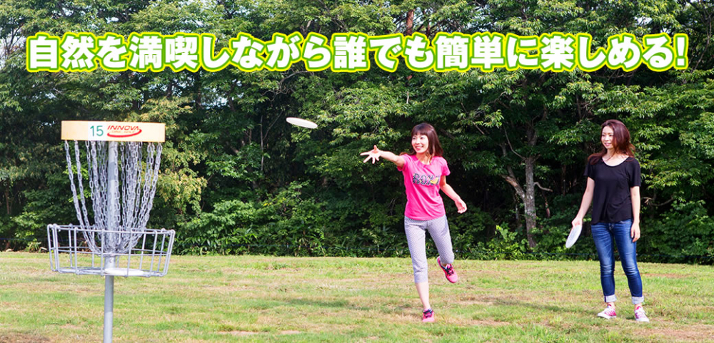 ゴルフボールの代わりにフライングディスクを使用し、バスケット型の専用ゴールに、何投で投げ入れることが出来るかを競うスポーツです。料金も300円と手軽に楽しめるアクティビティ。