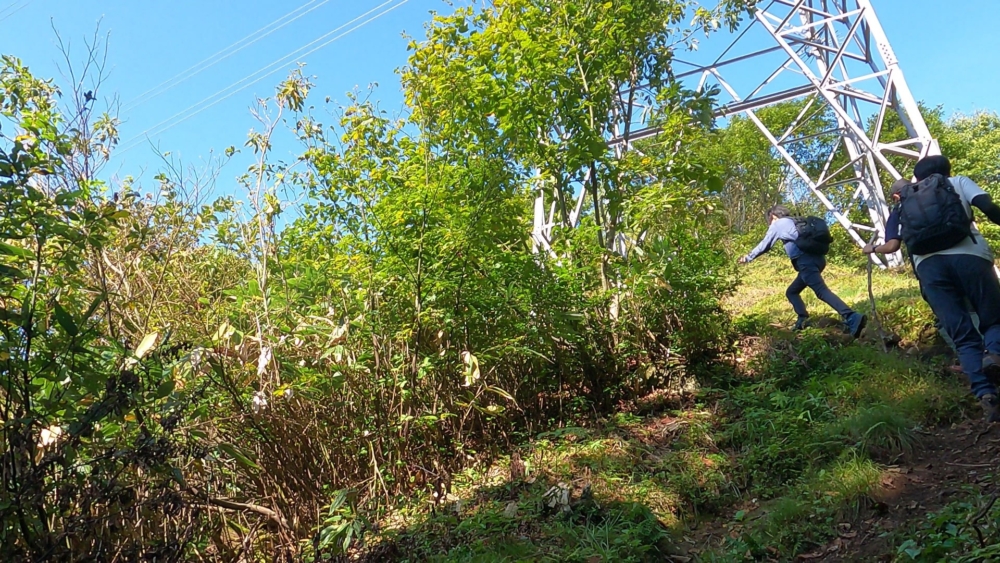 登山開始から15分~20分ぐらいの位置、登り行程の1割目ぐらいに鉄塔が立っています。ひるがの高原ルートはこの鉄塔の下をくぐっていくルートで、撮影スポットの一つです。