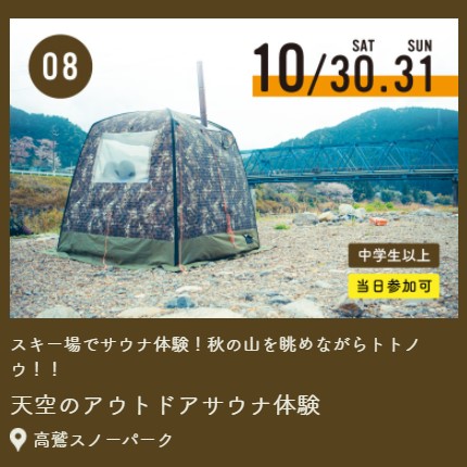 今話題のテントサウナが高鷲町にもやってきます。会場は高鷲スノーパーク。中学生以上の方が対象ですが、当日参加OKですので気軽にご参加いただけますよ。天空のテントサウナをお楽しみください。