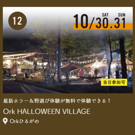 アウトドアリゾート『Orkひるがの』を全部使って、みなさんにOrk流の本格ハロウィンと外遊び体験をしていただきます。体験だけでなく、様々な限定グルメもご用意いたしましたので、心もお腹もいっぱいに満たして、夜までお楽しみ頂きたいと思います。