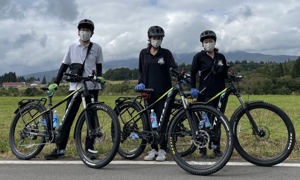 集合場所はゲストハウスキンザザさんです。宿泊施設を営みながらe-mtbを使ったツアーのガイドもしています。現地で必要事項をスマホで入力してツアーの説明を受けます。アシスト機能の使い方なども丁寧に教えてくれますし、ちょっとした広場ですべてのアシスト機能の試運転もできますので、安心して出発することができます。
